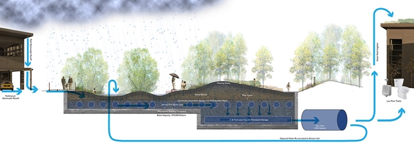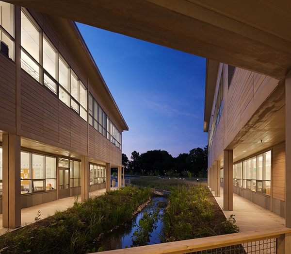 該學(xué)校滿(mǎn)足了以下幾個(gè)目標(biāo):1.達(dá)到LEED?評(píng)級(jí)系統(tǒng)標(biāo)準(zhǔn)(通過(guò)減少雨水的峰值速率和體積,保證1-2年的暴雨不受