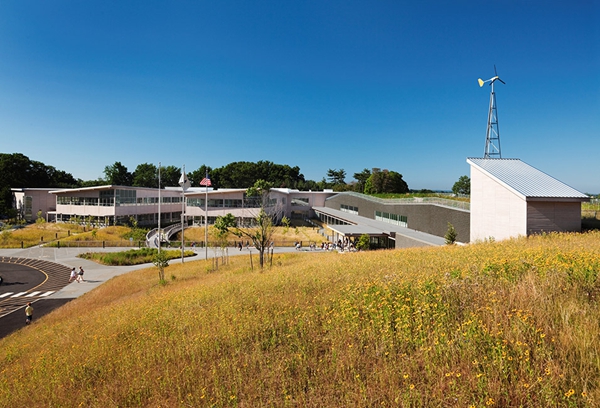 境:為學(xué)校設(shè)計(jì)的大型、密集的綠色屋頂;可以展示自然過(guò)濾過(guò)程的生態(tài)花園;雨水收集系統(tǒng)和展示“自由能源”的