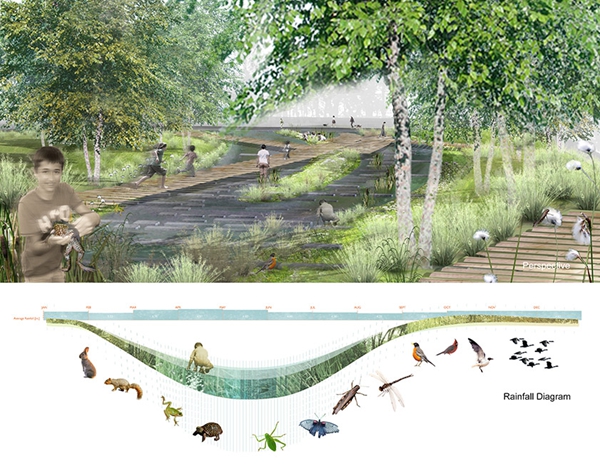 ,設(shè)置了具有雨水收集功能的“水庫(kù)”。收集來(lái)的預(yù)處理雨水通過(guò)這里流向濕地指定區(qū)域,利用植物將雨水吸收和過(guò)